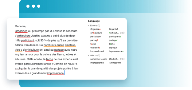 Correct your writing in real time directly in editable text fields on the web without ever opening Antidote. Live Correction speeds up your proofreading process almost anywhere online.