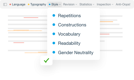 Assess how easy your text is to read using the readability filter and highlight elements that contribute to the even representation of women and men with the gender neutrality filter. Identify opportunities to add more punch to your writing by detecting wordy constructions and passive voice.