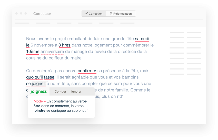 Le logiciel s’installe localement sur votre ordinateur Windows ou Mac. Profitez du meilleur correcteur, de riches dictionnaires et de guides linguistiques détaillés. En savoir plus