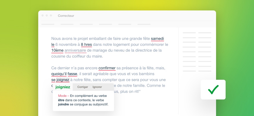 Son registre est très vaste : il corrige les erreurs d’accord (sujet-verbe, participe passé, groupe nominal, adjectif, etc.), le mode du verbe, la ponctuation, l’écriture des nombres et celle des adresses, les conventions de la rédaction administrative, l’emploi des traits d’union, les termes anglais, l’emploi des majuscules, l’élision et l’euphonie ; il signale les homophones, les paronymes, les faux amis et autres possibilités de confusion, les calques, les pléonasmes, les expressions et emplois régionaux, et les écarts de niveau de langue. Il répartit ses diagnostics entre linguistique, typographie et style, pour une correction plus homogène. Des réglages détaillés permettent de moduler la nature et le nombre des alertes.