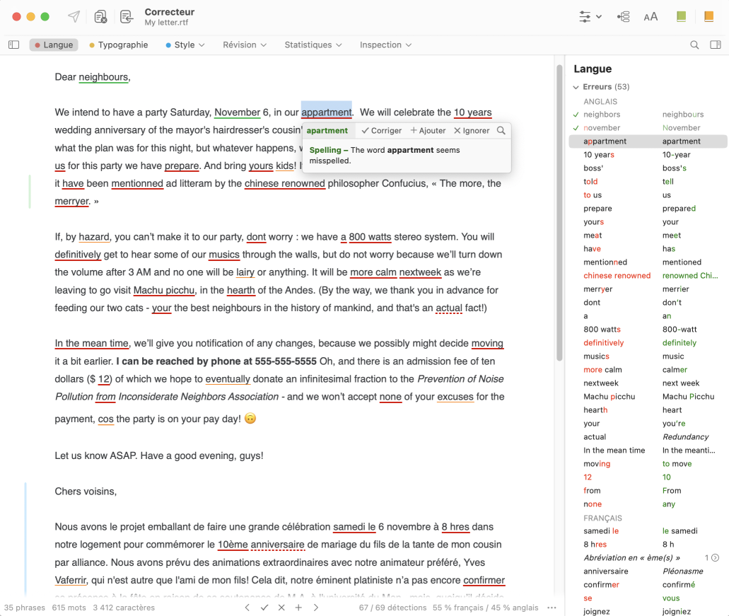Au bas de la fenêtre du correcteur, on trouvera aussi une statistique (par exemple : 8 % français / 92 % anglais) qui précise la répartition des deux langues dans un texte donné.