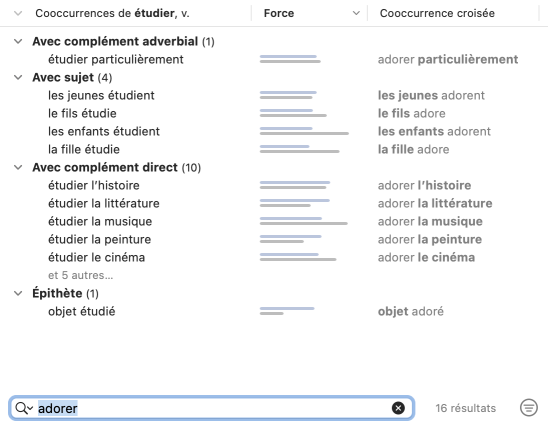 Le dictionnaire de cooccurrences présente l’ensemble des combinaisons lexicales les plus remarquables du mot en vedette, classées selon le contexte syntaxique, la force de cooccurrence et, s’il y a lieu, les divers sens du mot en vedette.