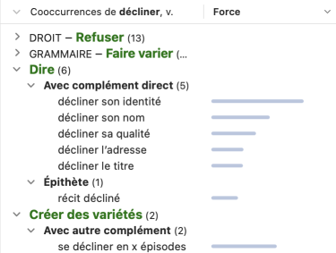 Un trait bleu après chaque cooccurrence indique sa force statistique relative : plus le trait est long, plus la cooccurrence est forte par rapport aux autres cooccurrences dans le même contexte. La force dépend de la fréquence, mais aussi de la singularité de l’association des termes.