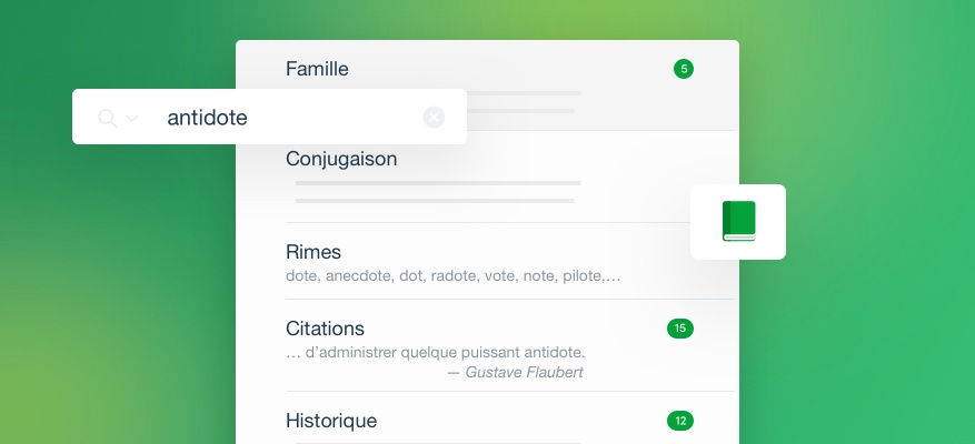 Antidote réunit ainsi de multiples dictionnaires du français, en une interface unifiée de consultation et de présentation. Des définitions aux synonymes, des cooccurrences aux champs lexicaux, de la famille aux rimes, les dictionnaires d’Antidote offrent une référence lexicale d’une richesse, d’une variété et d’une cohésion totalement inédites.