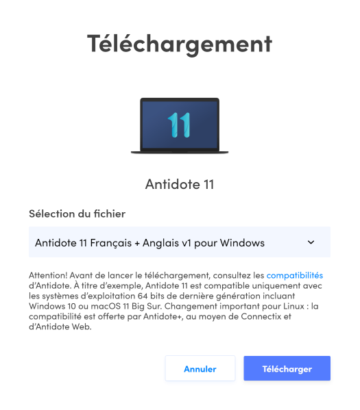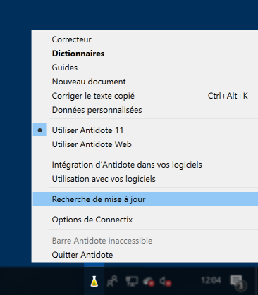 Assurez-vous de maintenir votre logiciel Antidote à jour. Pour vérifier si des mises à jour sont offertes pour votre version d’Antidote, cliquez avec le bouton droit sur l’Agent Connectix (la petite fiole qui se trouve dans la zone de notification) et sélectionnez Recherche de mise à jour. Cette fonction est aussi offerte dans le menu Aide d’Antidote 11.