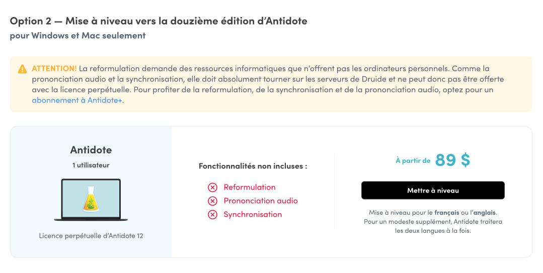 Si vous préférez obtenir un accès à toutes les fonctions et à toutes les applications (Antidote 12, Antidote Web et Antidote Mobile), suivez plutôt la procédure pour l’achat d’une mise à niveau vers Antidote+.