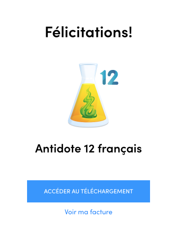 9 — Et voilà! Vous avez complété l’achat de votre mise à niveau vers Antidote 12. Cliquez sur Accéder au téléchargement pour obtenir les fichiers d’installation de votre logiciel dans votre Espace client.