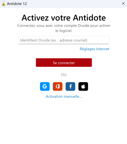 11 — Entrez votre identifiant Druide ainsi que votre mot de passe ou identifiez-vous avec l’un des partenaires de connexion pour activer votre Antidote 12. Il s’agit des mêmes informations de connexion que pour votre Espace client.