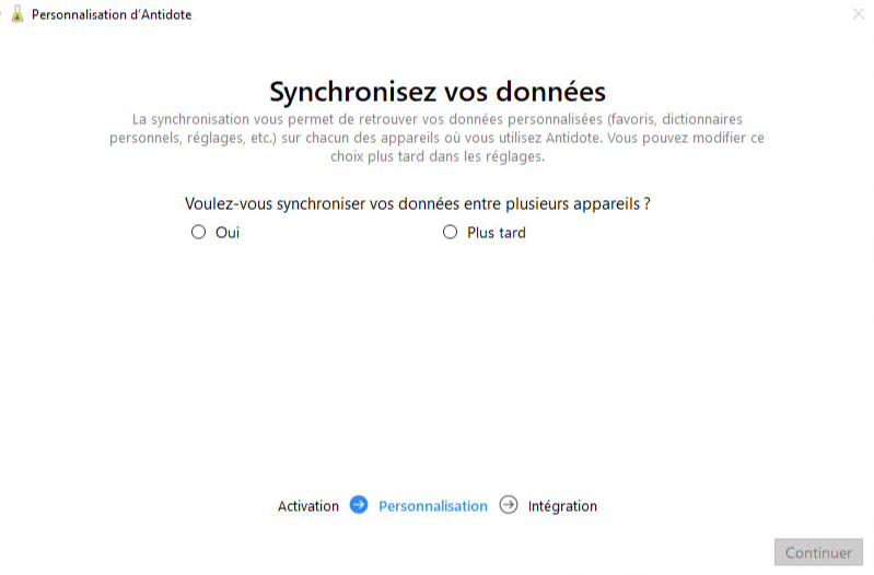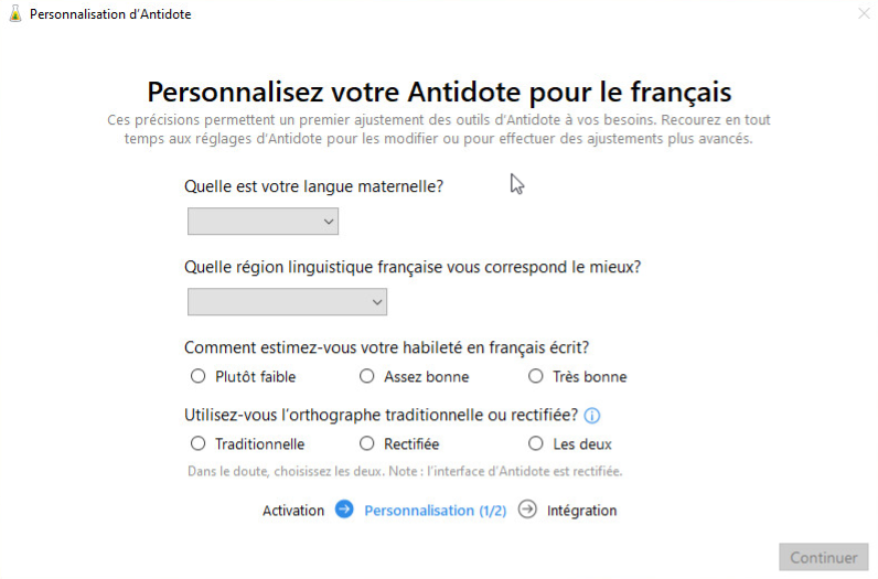 13 — Après la synchronisation, Antidote vous pose quelques questions langagières pour personnaliser les réglages.
