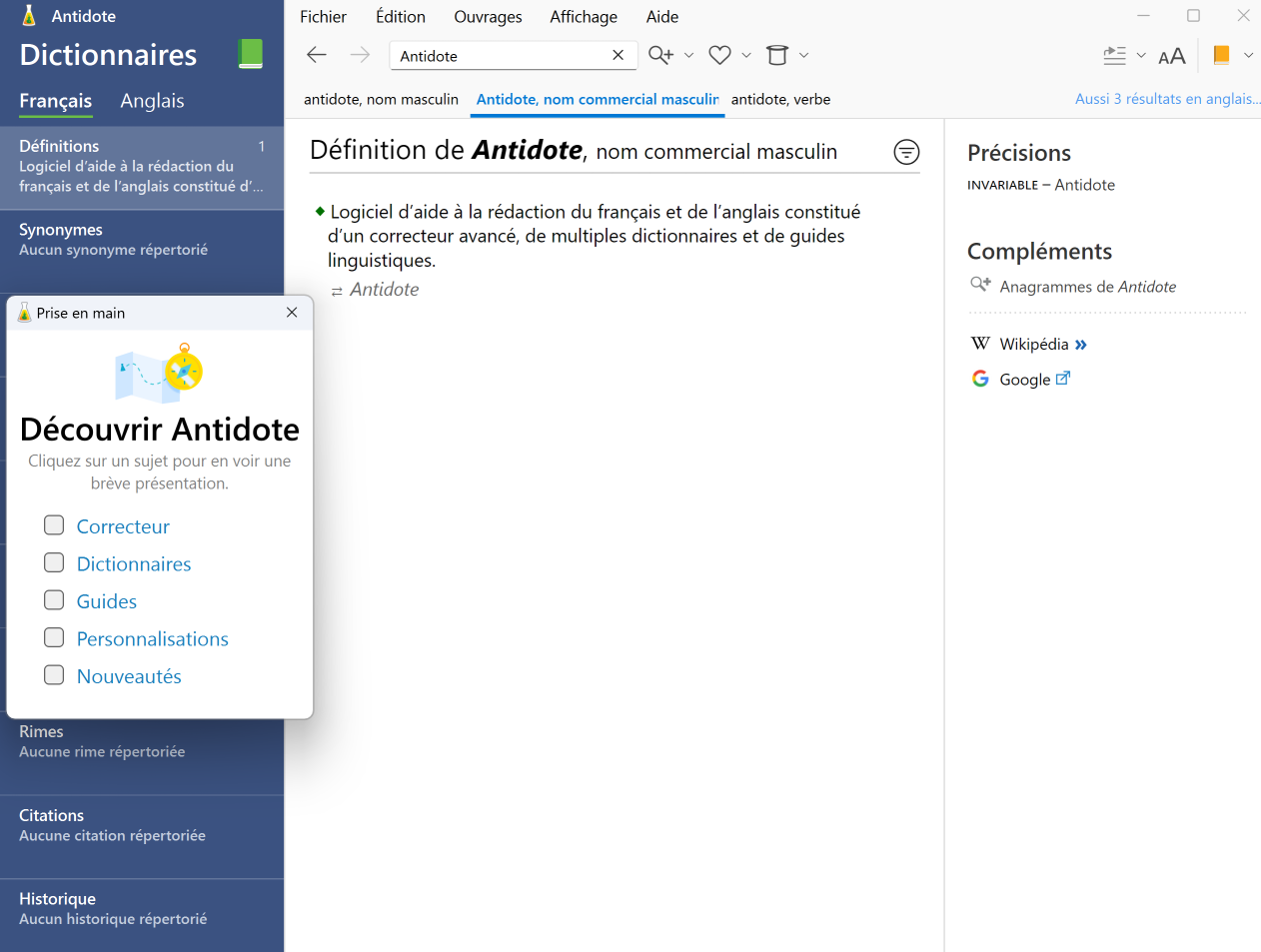 Conseil — Consultez les différentes rubriques de la fenêtre Découvrir Antidote, aussi accessibles sur notre site. Elles contiennent entre autres de courtes vidéos de présentation des outils.