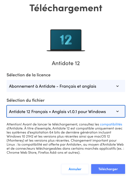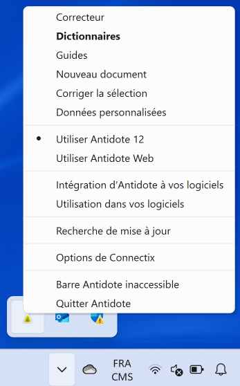 Assurez-vous de maintenir votre logiciel Antidote à jour. Pour vérifier si des mises à jour sont offertes pour votre version d’Antidote, cliquez avec le bouton droit sur l’Agent Antidote (la petite fiole qui se trouve dans la zone de notification) et sélectionnez Recherche de mise à jour. Cette fonction est aussi offerte dans le menu Aide d’Antidote 12.
