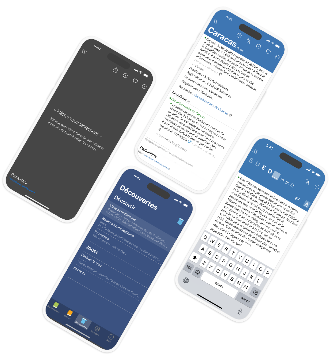 Partez à la conquête des trésors du français ou de l’anglais en découvrant de nouveaux mots, des proverbes ou des curiosités étymologiques. Voyez défiler, au choix, mots rares ou fréquents, noms de pays, de villes ou de personnages, ou sites du Patrimoine mondial de l’UNESCO. Ajoutez vos découvertes à une liste de mots personnalisée pour y revenir facilement; partagez vos listes avec vos amis, vos émules ou vos élèves. Testez vos connaissances en jouant à deviner, à partir de leur définition, une série de mots au hasard ou une liste de mots personnalisée; partagez vos résultats sur Facebook ou X.
