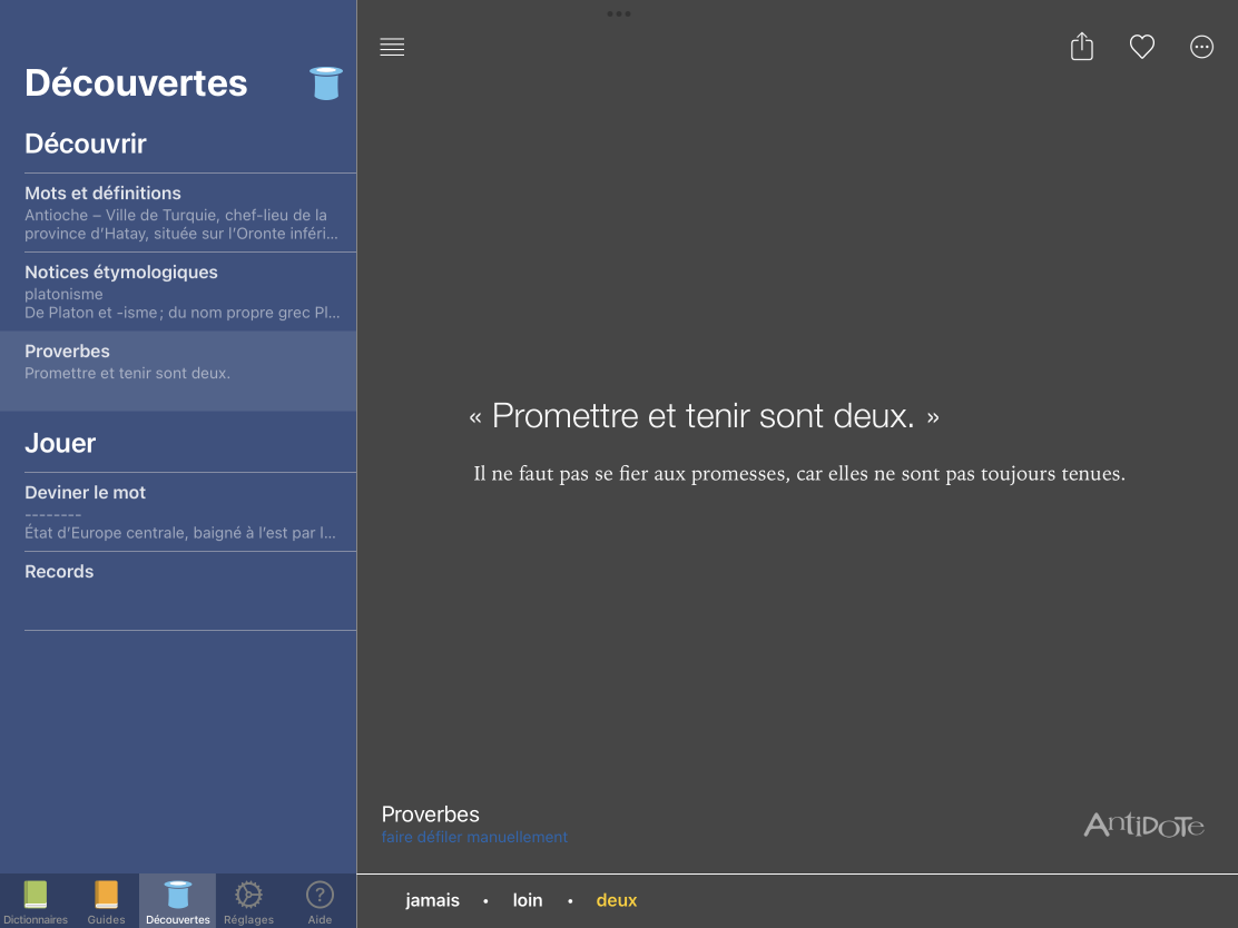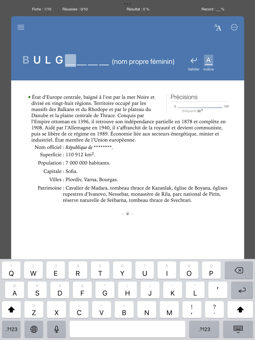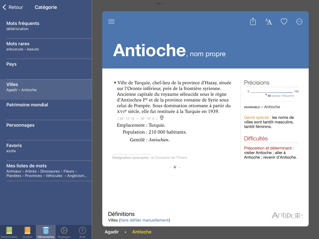 Découvrez des mots rares et des noms de pays, de villes ou de personnages. Ajoutez ceux qui vous plaisent à vos favoris, pour mieux les retenir.