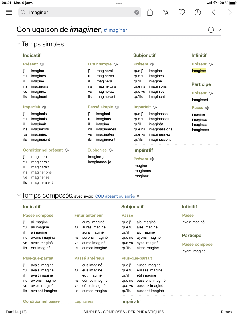 Voyez d’un coup d’œil la conjugaison à tous les temps; appuyez sur un temps pour entendre sa conjugaison ou afficher la phonétique de chacune de ses formes.