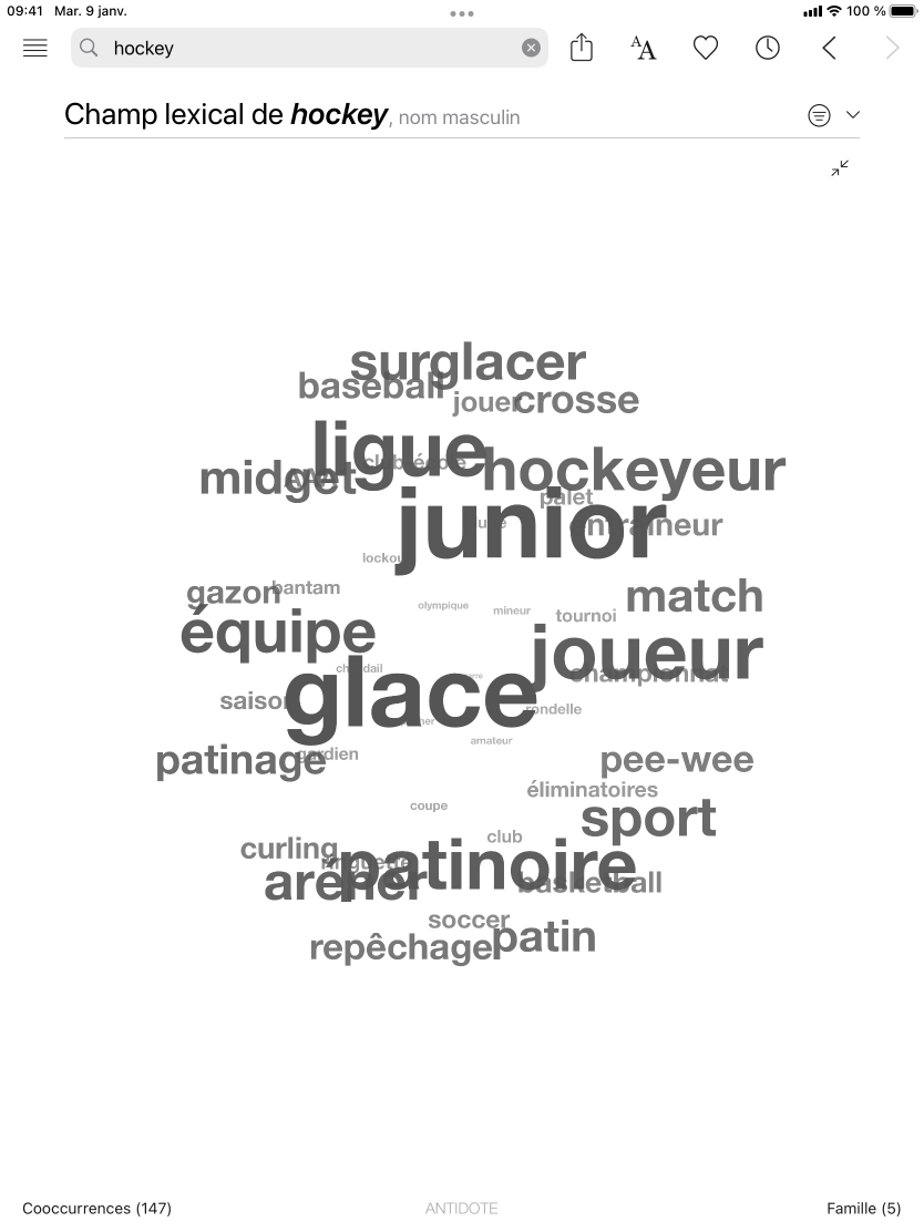 Le dictionnaire de champs lexicaux présente l’ensemble des mots sémantiquement apparentés au mot en vedette, regroupés par sens et classés par force relative.