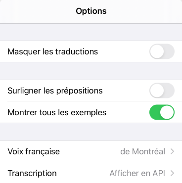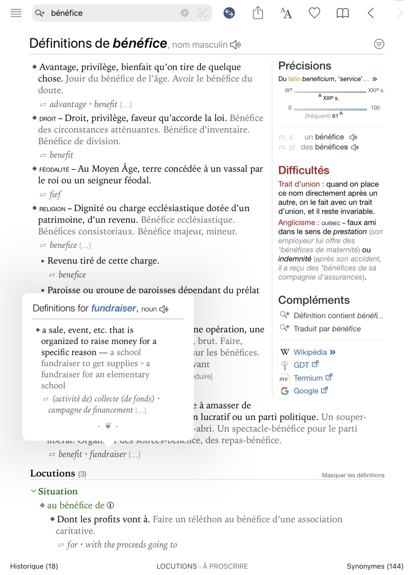 Les définitions, précises et riches en exemples, sont d’autant plus pratiques que chaque mot qui s’y trouve peut à son tour être consulté par un simple toucher. En colonne à droite, une série de précisions dresse un portrait plus détaillé du mot. Dans l’édition bilingue, les traductions de chacun des sens des mots et des locutions peuvent être affichées, et ce, aussi bien du français à l’anglais que l’inverse.