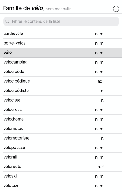 Le dictionnaire de familles présente sous forme de liste tous les mots de la famille morphosémantique à laquelle appartient le mot en vedette. Une famille regroupe les mots qui ont une racine morphologique commune et qui gravitent autour d’un sens commun.