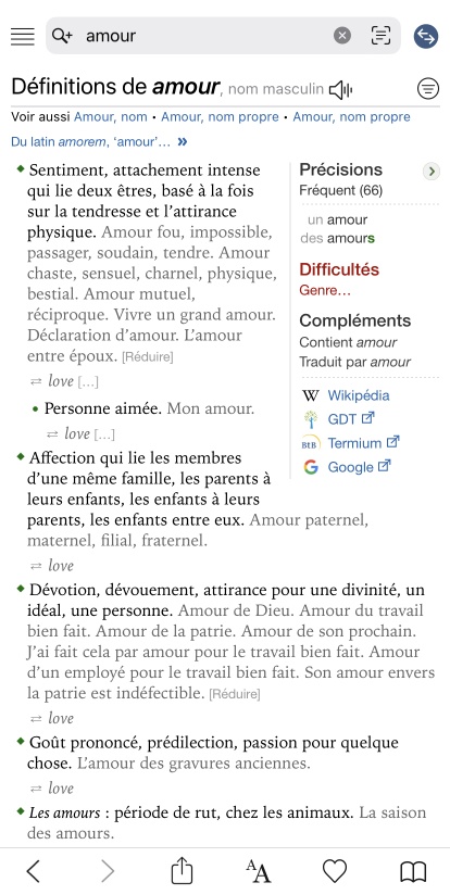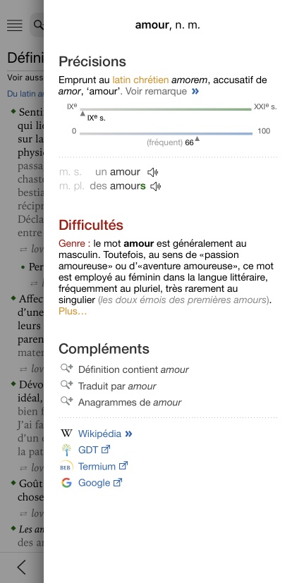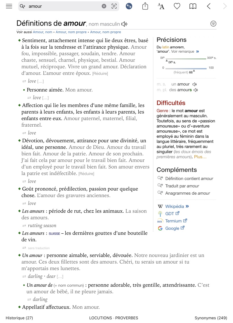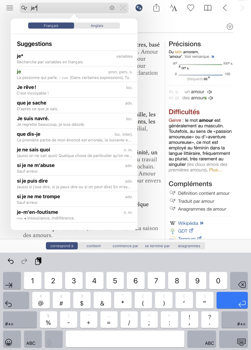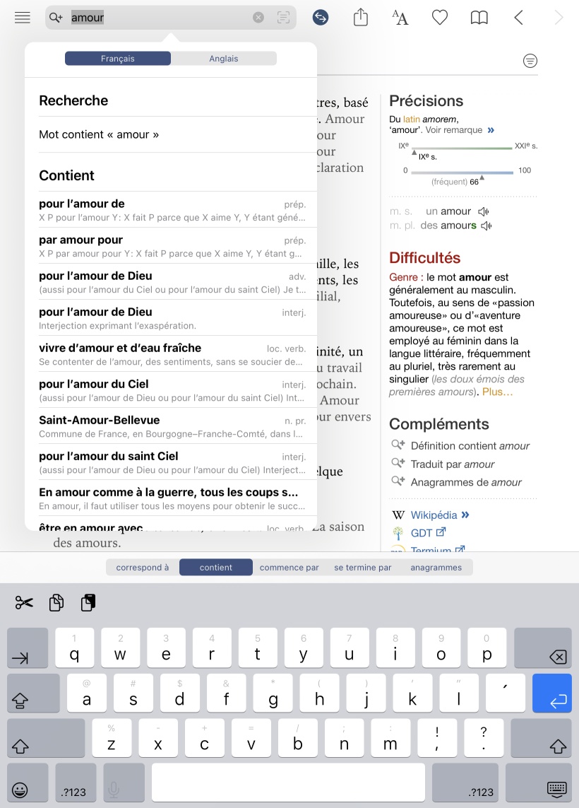 Appuyez sur l’une des recherches prédéfinies de la rubrique Compléments du dictionnaire de définitions : Définition contient, Traduit par (édition bilingue seulement) ou Anagrammes de. Sur iPhone, seuls les raccourcis Contient et Traduit par s’affichent; ouvrez le panneau Précisions (1) pour accéder à toutes les recherches prédéfinies.