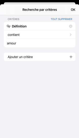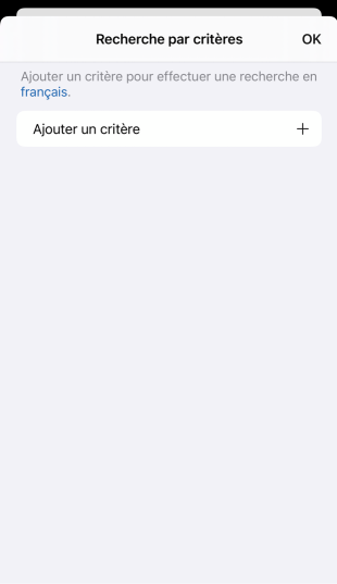 Pour l’une ou l’autre de ces façons de lancer la recherche par critères, le critère initial et ses paramètres s’affichent quand vous appuyez sur la loupe . Vous pouvez ensuite les modifier ou ajouter d’autres critères.