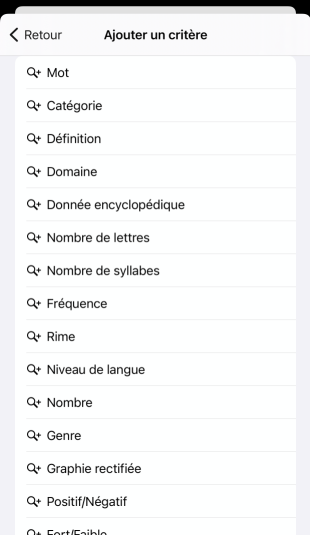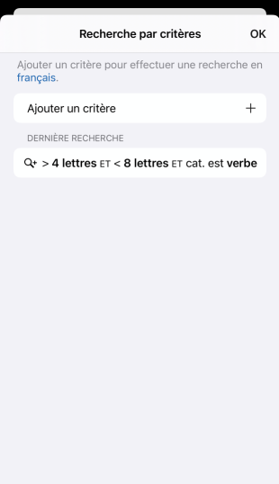 Appuyez sur Ajouter un critère dans le panneau de recherches par critères. Vous pouvez ajouter plusieurs critères différents, ou un même critère plus qu’une fois avec des paramètres différents (ex. : « Nombre de lettres plus grand que 4 » et « Nombre de lettres plus petit que 8 »).