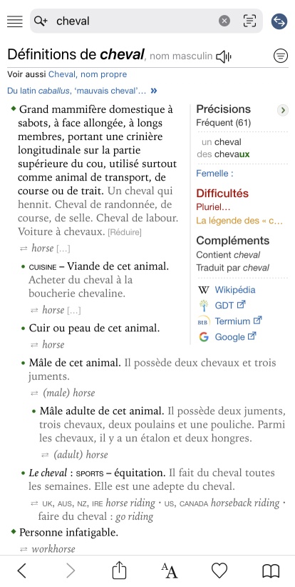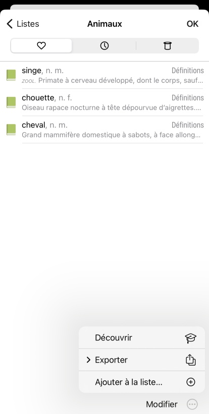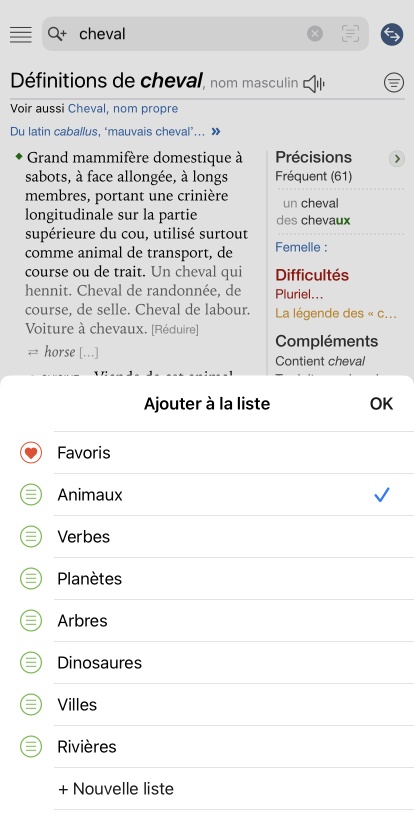 Dans les dictionnaires, dans les guides ou dans les découvertes, appuyez sur le cœur pour voir les listes de favoris existantes. Ajoutez le mot ou l’article courant en sélectionnant Favoris ou l’une des listes. Vous pouvez sélectionner plusieurs listes. Appuyez sur + Nouvelle liste pour ajouter une liste.