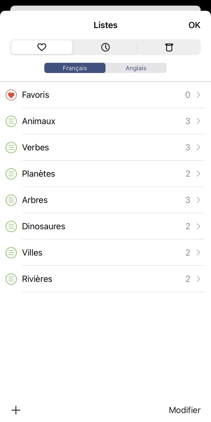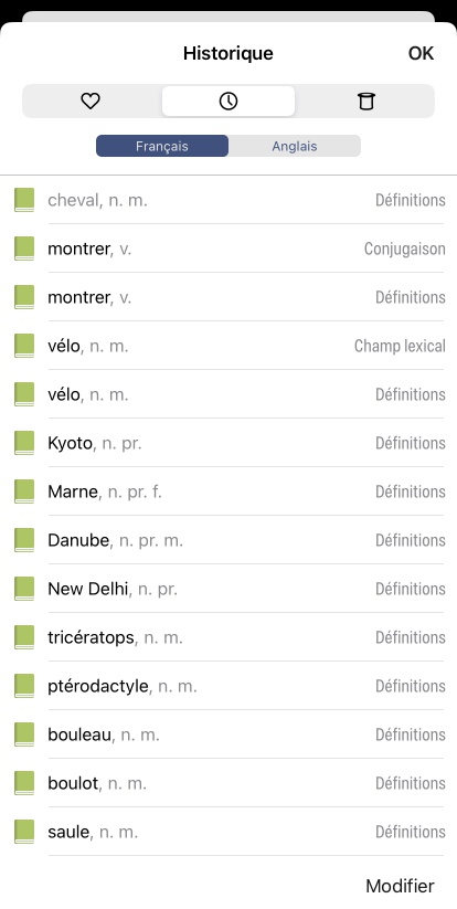 Dans les dictionnaires ou les guides, appuyez sur l’icône de livre pour afficher le panneau Listes. En plus de tenir l’historique des mots ou articles consultés ou des entrées présentés dans les découvertes, ce panneau permet également de gérer vos listes.