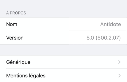 Section affichant les informations générales sur l’application, telles que le nom, la version, le générique et les mentions légales. Le nom et le numéro de version sont particulièrement utiles lorsque vous communiquez avec notre service à la clientèle.