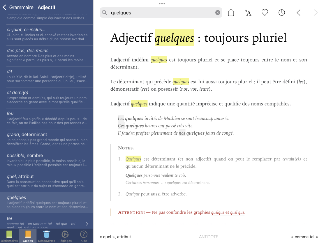 Profitez de l’accès intégré à l’encyclopédie Wikipédia, sans avoir à quitter Antidote Mobile (connexion Internet requise).