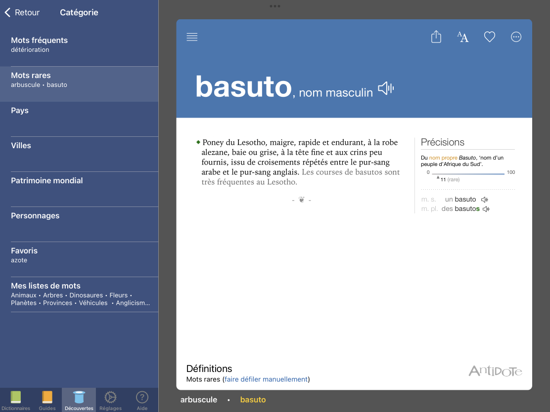 Découvrez des mots rares et des noms de pays, de villes ou de personnages. Ajoutez ceux qui vous plaisent à vos favoris, pour mieux les retenir.