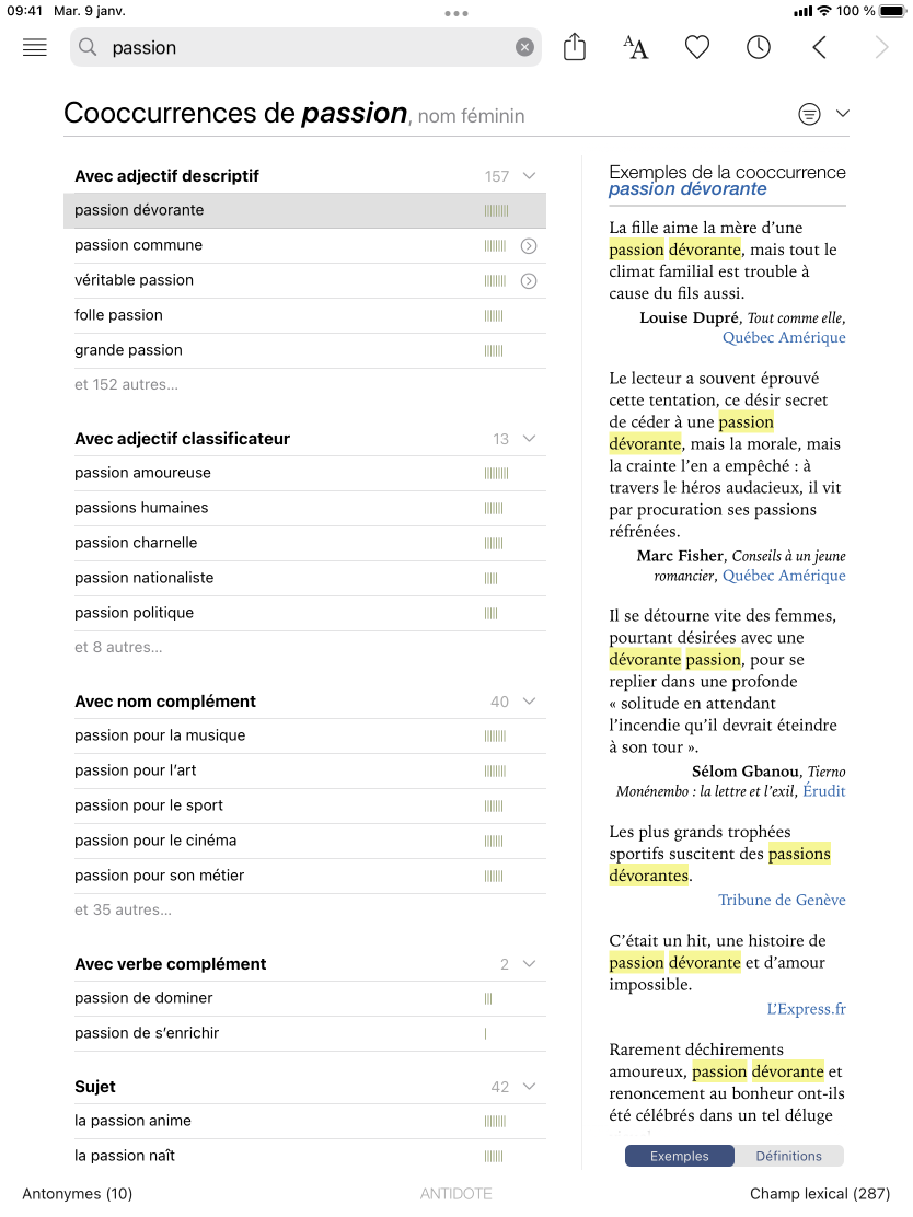 Consultez un million de cooccurrences et autant d’exemples vous montrant les combinaisons les plus significatives de chaque mot.