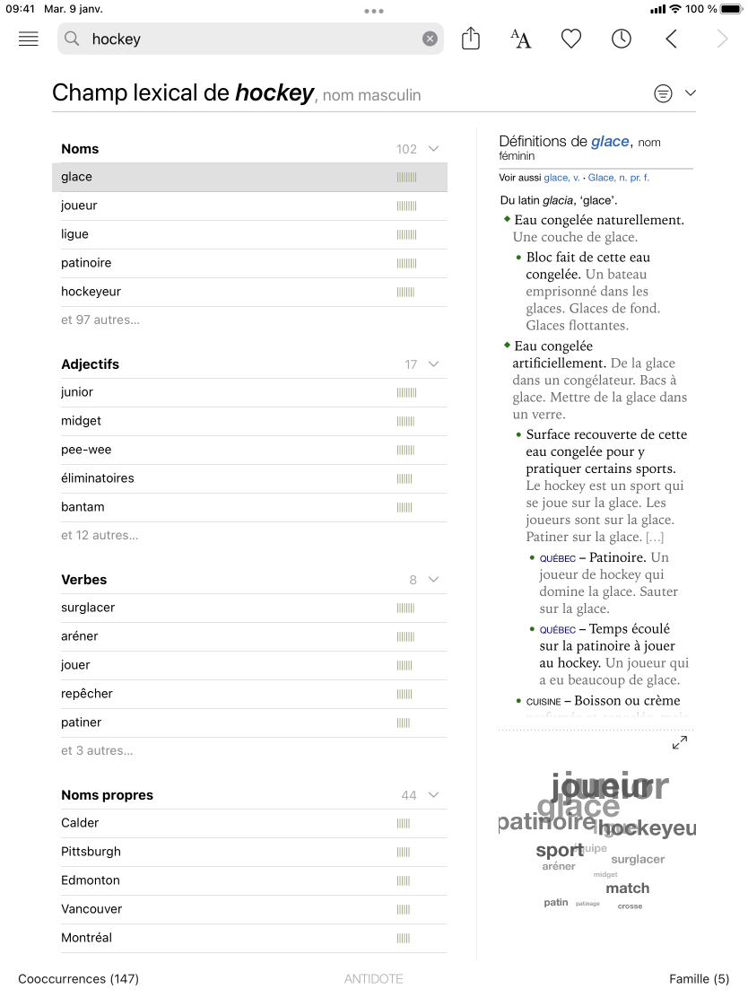 Le dictionnaire de champs lexicaux présente l’ensemble des mots sémantiquement apparentés au mot en vedette, regroupés par sens et classés par force relative.