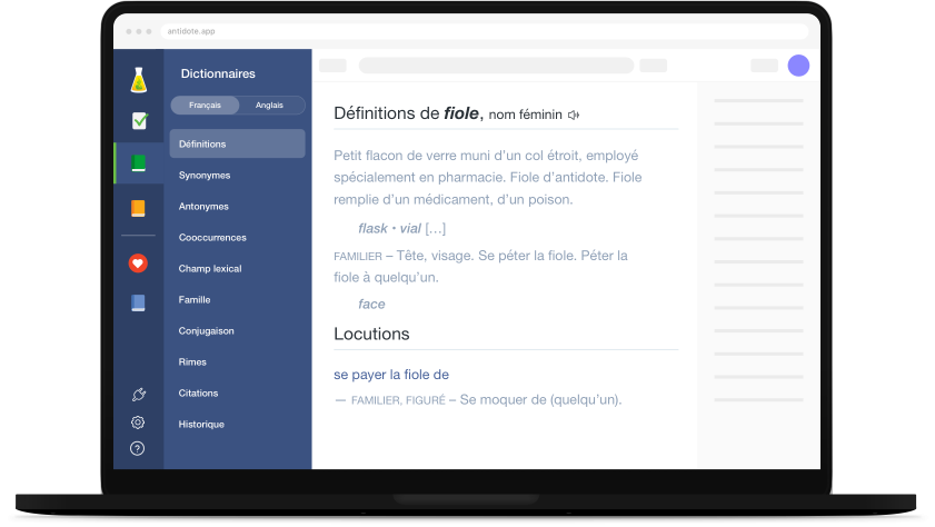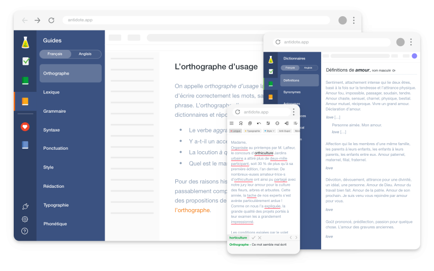 Accédez à l’application complète en ligne sur antidote.app. Profitez du meilleur correcteur, de dictionnaires riches et complets ainsi que de guides linguistiques clairs et détaillés dans la fenêtre de votre navigateur préféré.