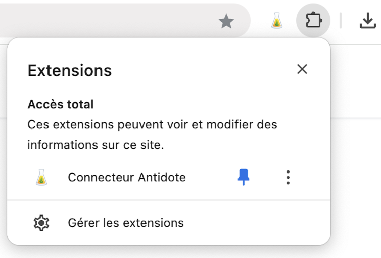 La fiole du Connecteur Antidote se trouve dans la barre d’outils du navigateur. Chrome, Firefox et Edge affichent l’icône , tandis que Safari affiche l’icône .