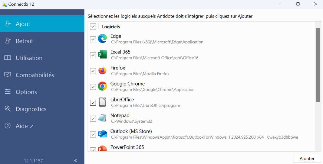 Connectix s’ouvrira automatiquement et affichera la liste de vos logiciels compatibles pour lesquels vous pouvez ajouter un connecteur. Cochez tous les logiciels auxquels vous souhaitez intégrer Antidote (A), puis cliquez sur Ajouter (B).