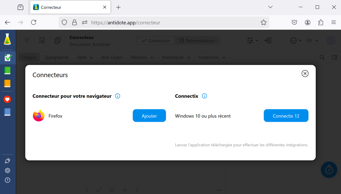 Pour intégrer Antidote Web à vos logiciels, il faut d’abord ajouter les connecteurs pertinents. Sélectionnez l’onglet qui correspond à votre système d’exploitation pour savoir comment faire : Windows, Mac ou Chromebook.