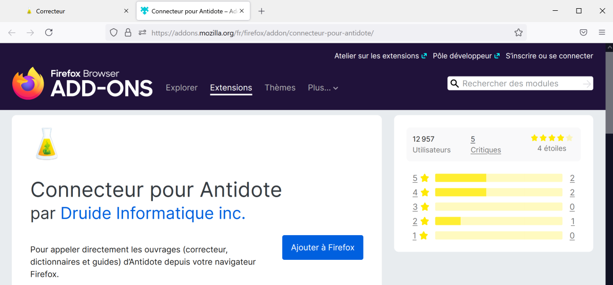Guide de démarrage / Utilisation d’Antidote Web dans vos logiciels / Ajouter les connecteurs / Navigateur seulement / Firefox