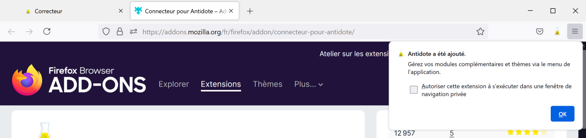 Une fenêtre de confirmation indique que le connecteur a été ajouté. La fiole d’Antidote apparait désormais dans la barre d’outils du navigateur.
