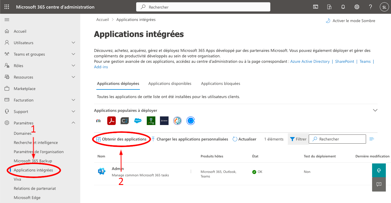 - Depuis le Centre d’administration Microsoft 365, sélectionnez Applications intégrées dans le menu Paramètres (1). Cliquez ensuite sur Obtenir des applications (2).