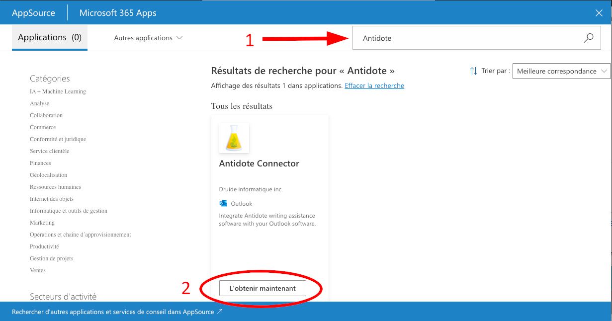 - Un panneau s’ouvrira; tapez Antidote dans la barre de recherche (1), puis cliquez sur le bouton L’obtenir maintenant (2) se trouvant sous le résultat Antidote Connector.