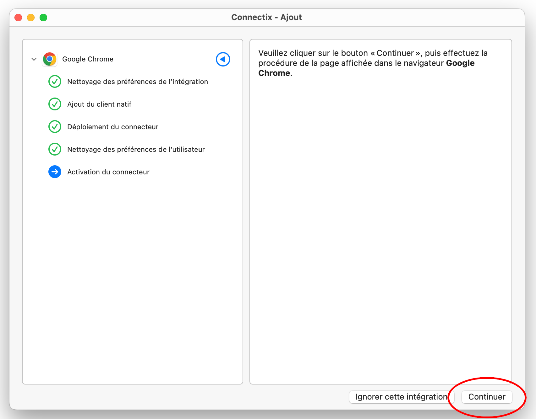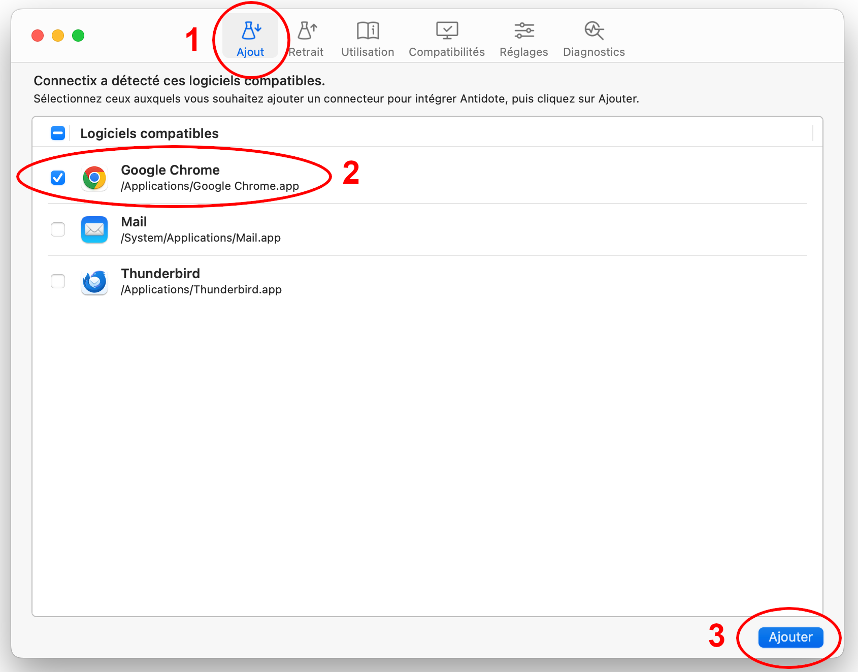 - Dans Connectix, choisissez l’onglet Ajout (1), puis cochez Google Chrome (2). Cliquez ensuite sur Ajouter (3).