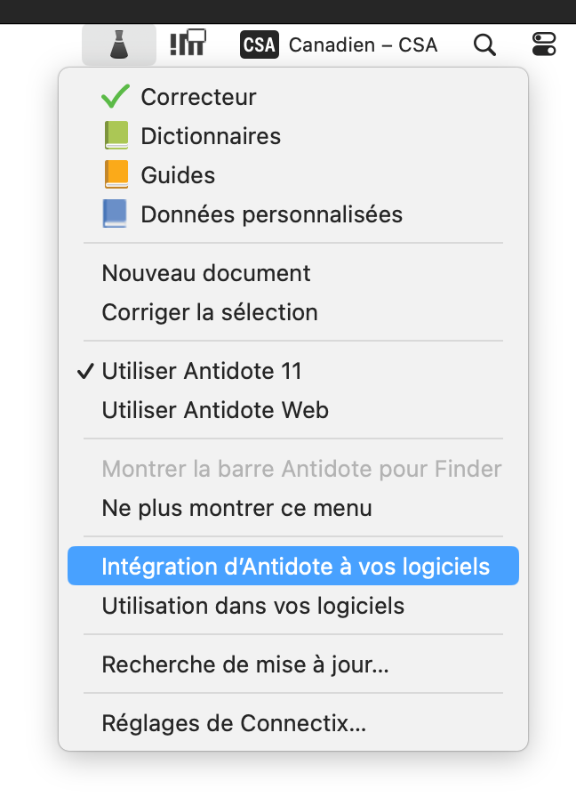 - Assurez-vous d’abord que votre navigateur est fermé, puis lancez l’Agent Antidote depuis la barre de menus, et choisissez Intégration d’Antidote à vos logiciels.
