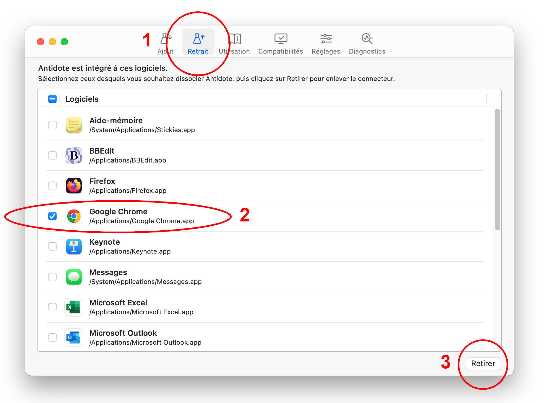 - Dans Connectix, choisissez Retrait dans la colonne de gauche (1), puis cochez Google Chrome (2). Cliquez ensuite sur Retirer (3).