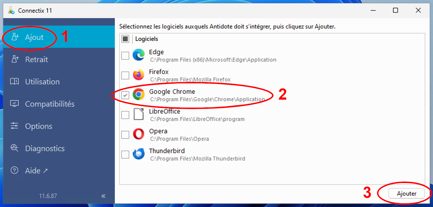 - Dans Connectix, choisissez Ajout dans la colonne de gauche (1), puis cochez Google Chrome (2). Cliquez ensuite sur Ajouter (3).