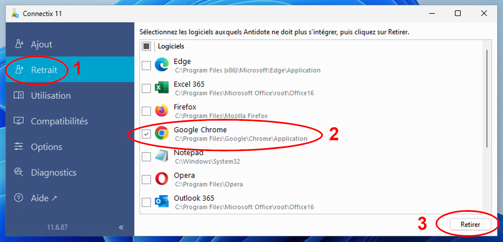 - Dans Connectix, choisissez l’onglet Retrait (1), puis cochez Google Chrome (2). Cliquez ensuite sur Retirer (3).