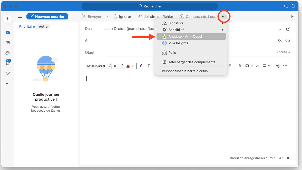 - Si le bouton d’Antidote n’apparaît pas, cliquez sur les trois points situés dans le coin supérieur droit de la fenêtre, puis sélectionnez Antidote - Anti-Oups! dans le menu déroulant.