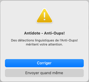 - Si un courriel contient des erreurs et/ou des pièces jointes manquantes, l’Anti-Oups! se déclenchera et proposera de consulter les détections en lançant le correcteur manuellement.