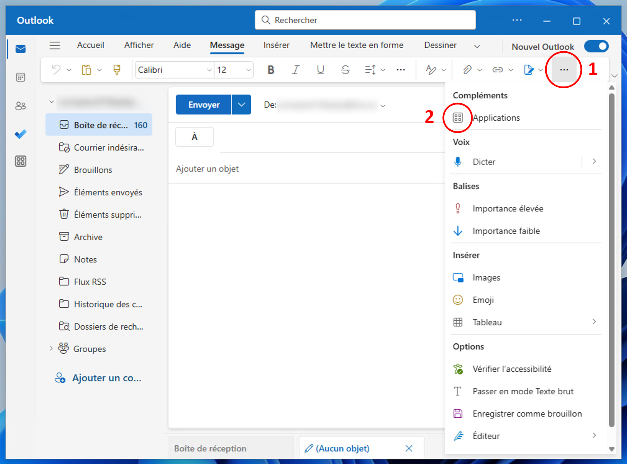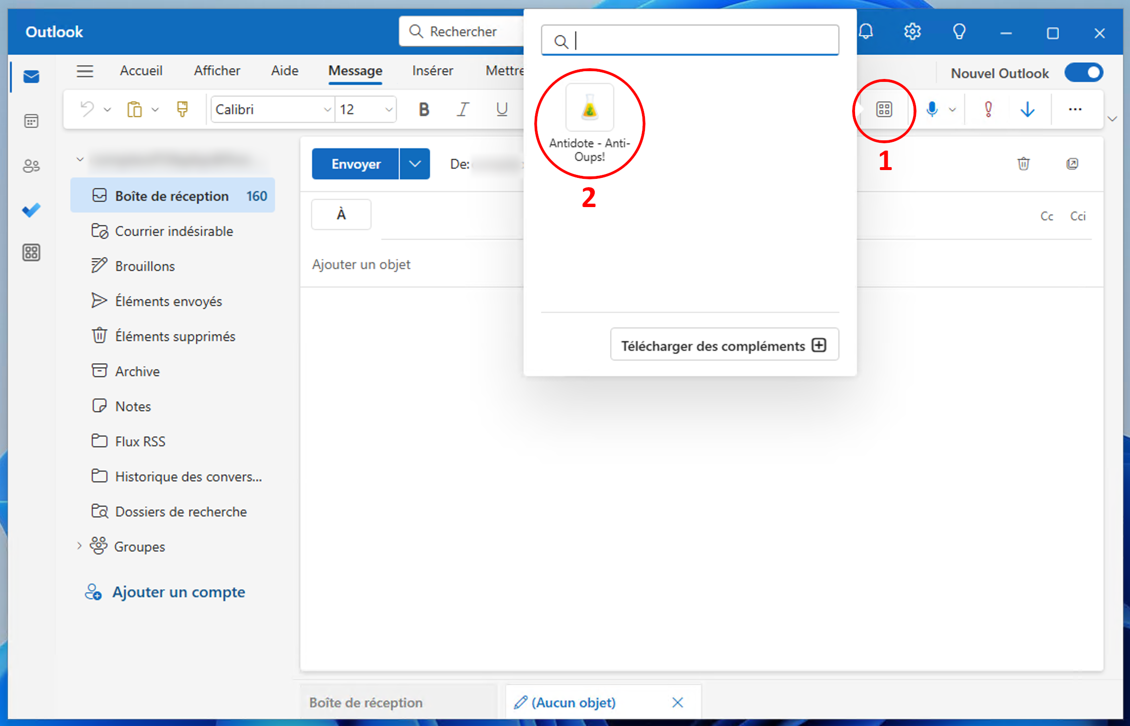 - Pour faire apparaître le ruban d’Antidote, créez un message ou répondez à un message existant. Cliquez ensuite sur le bouton Applications (1), puis sur le complément Antidote - Anti-Oups! (2).