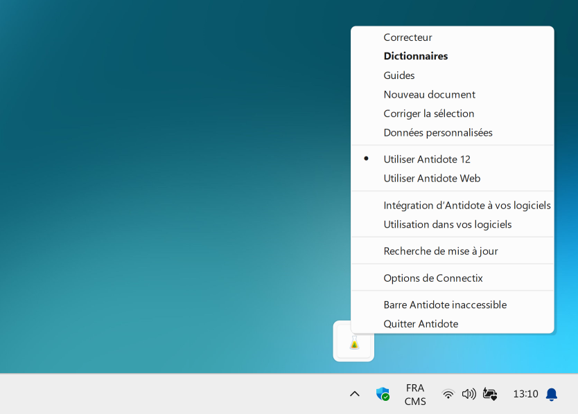 Si vous travaillez dans l’application locale de Word (et non sa version en ligne), vous pouvez aussi utiliser l’Agent Antidote. Cliquez sur la petite fiole qui figure dans la barre des menus sur Mac ou dans la zone de notification sur Windows (clic sur le chevron pour dévoiler la fiole, puis clic droit sur la fiole). Sélectionnez ensuite Correcteur, Dictionnaires ou Guides dans le menu qui apparait. Même s’il semble en dehors de Word, l’Agent Antidote repère la fenêtre dans laquelle vous travaillez et lance les outils linguistiques comme pour le menu Antidote.