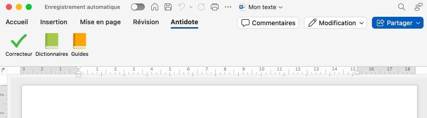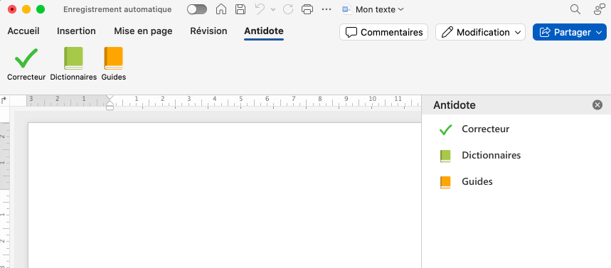 Un onglet Antidote s’affiche dans le ruban pour un accès facile au correcteur, aux dictionnaires et aux guides linguistiques.