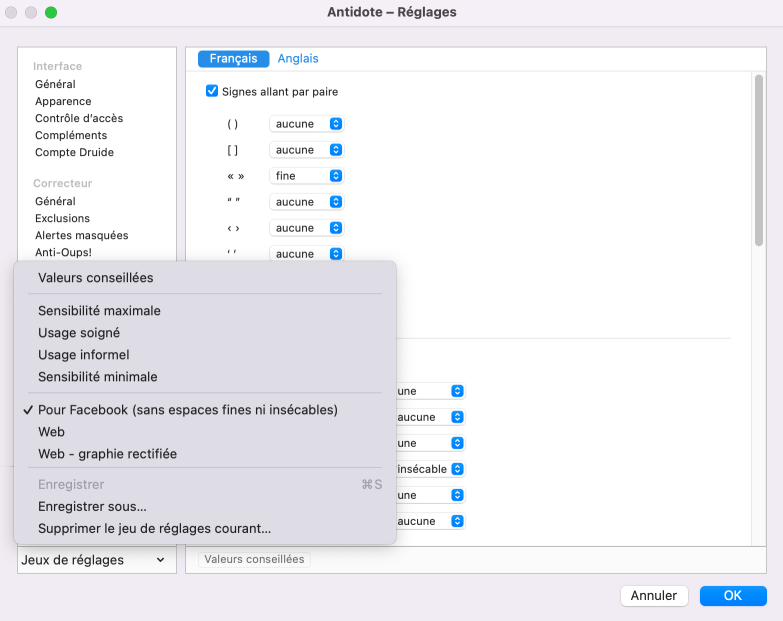 Antidote vous propose aussi quatre jeux de réglages par défaut, avec différents degrés de détections typographiques :